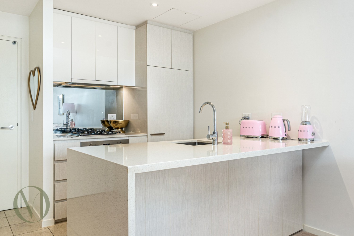 • Open gourmet kitchen with gas cooking, stainless steel appliances and Caesar stone benchtop