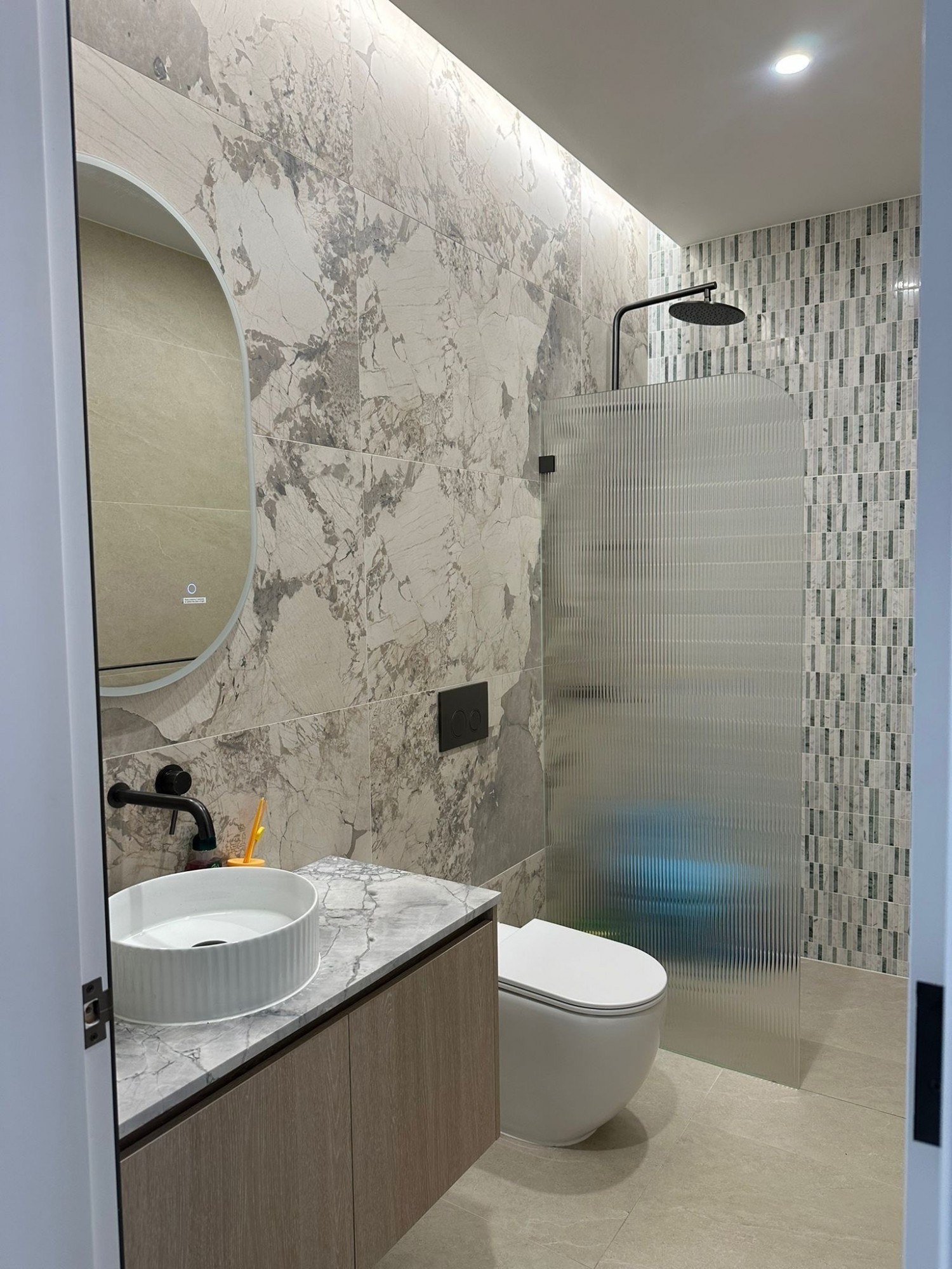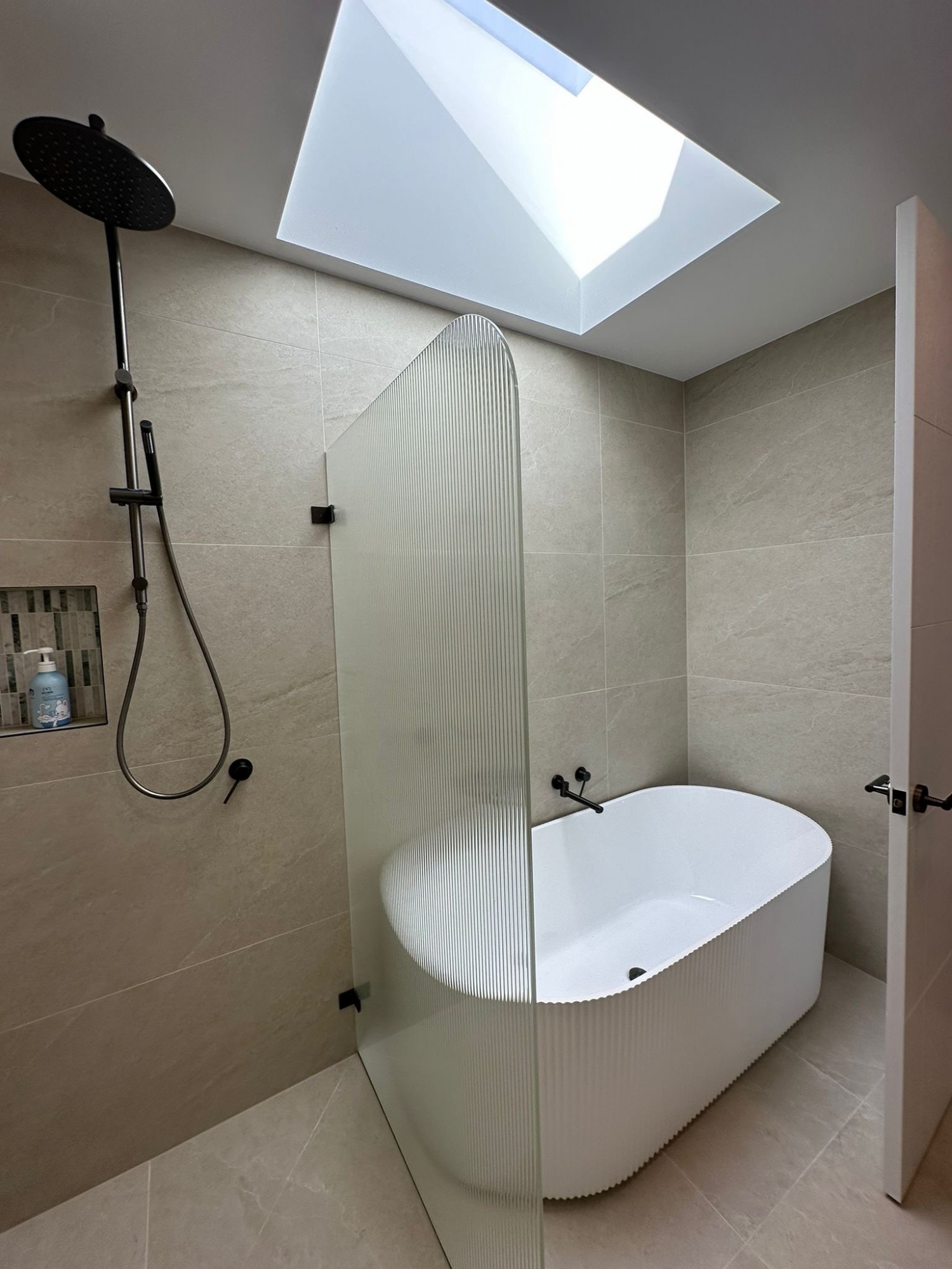 Four elegant bathrooms with floor-to-ceiling tiles