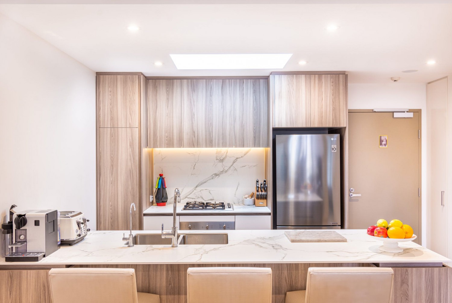 The residence is immaculately presented and offers a large study area, premium finishes throughout, including high ceilings, timber veneer flooring, and a sleek stone kitchen with stainless-steel gas appliances.