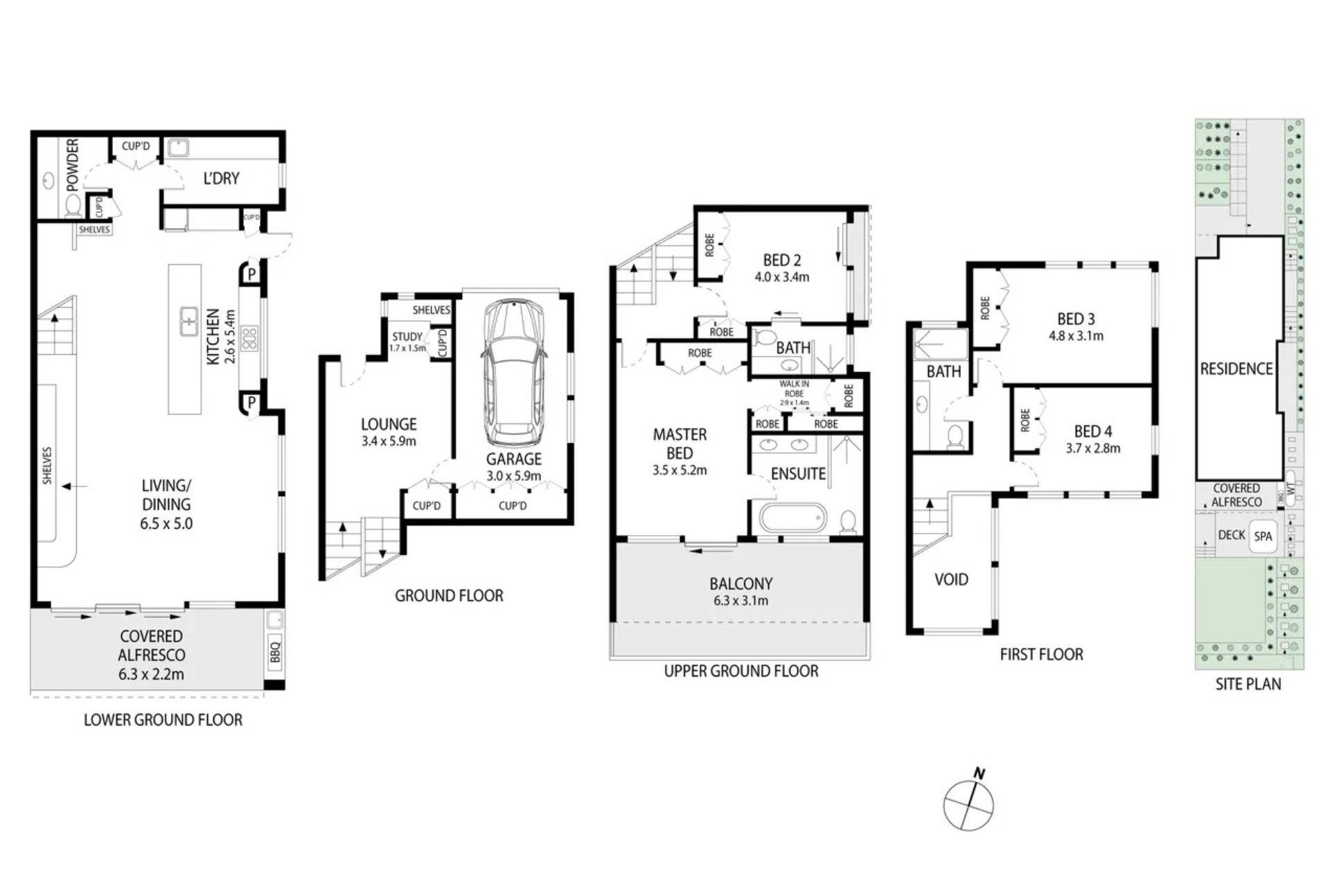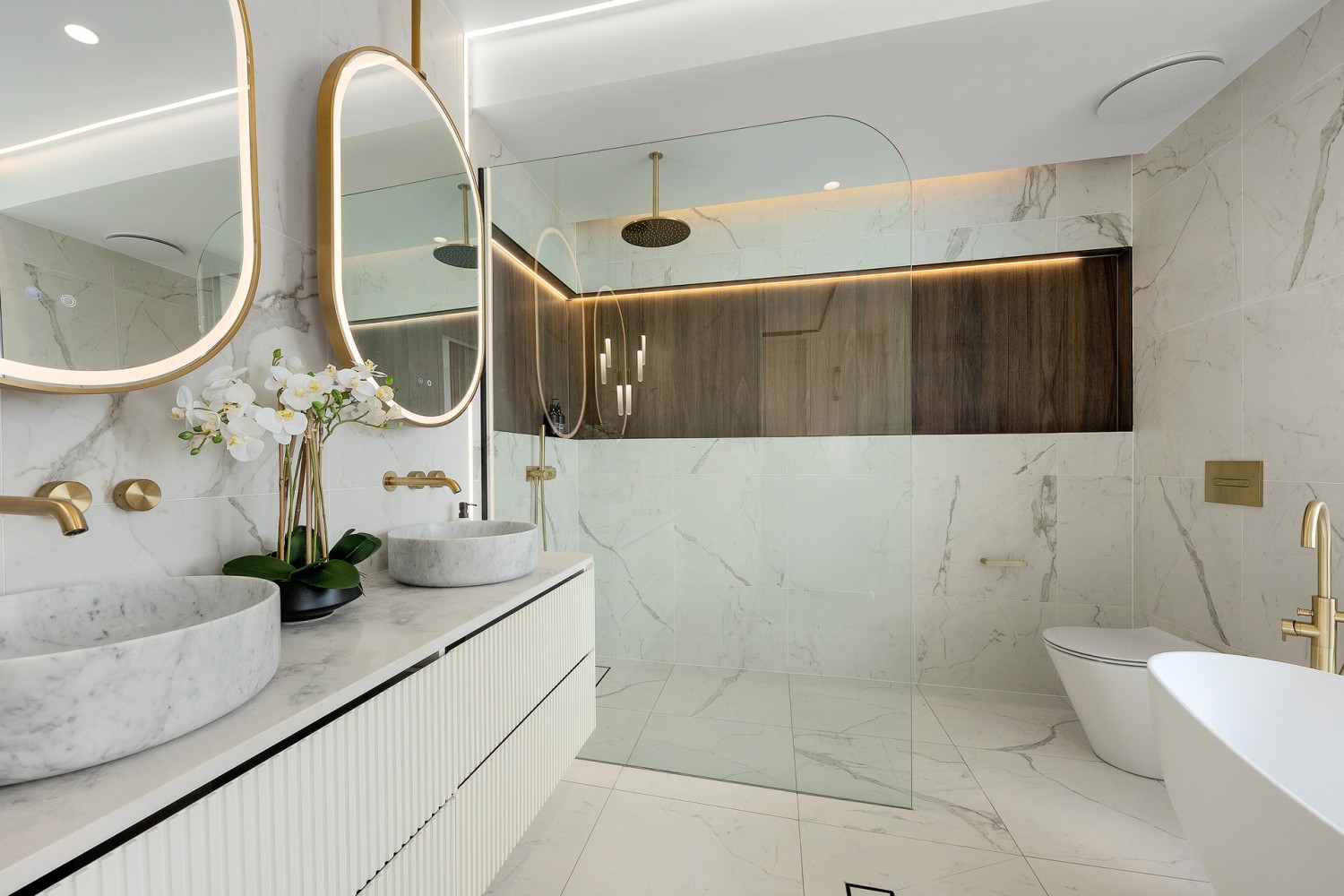 The separate-level master suite is a private retreat with walk-in robes, a stunning his-and-her ensuite, and a freestanding bathtub. All four bedrooms are generously sized and enjoy private or shared ensuite access. Premium finishes like oak timber flooring, custom joinery, and integrated wine storage elevate every corner.