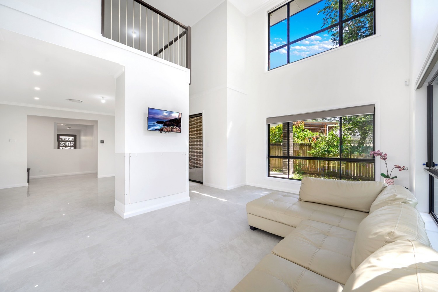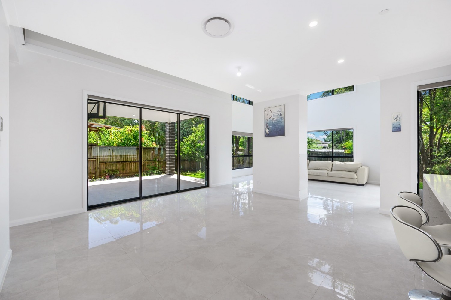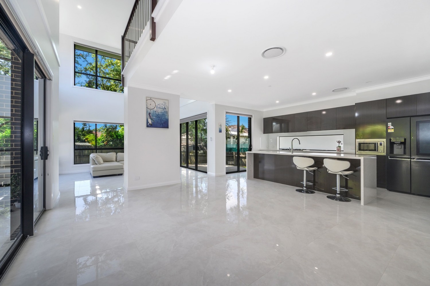- Multiple living zones including a huge open-plan lounge and dining area, with a 2.7m ceiling that seamlessly flows into the massive high ceiling void with impressive North/East facing windows.