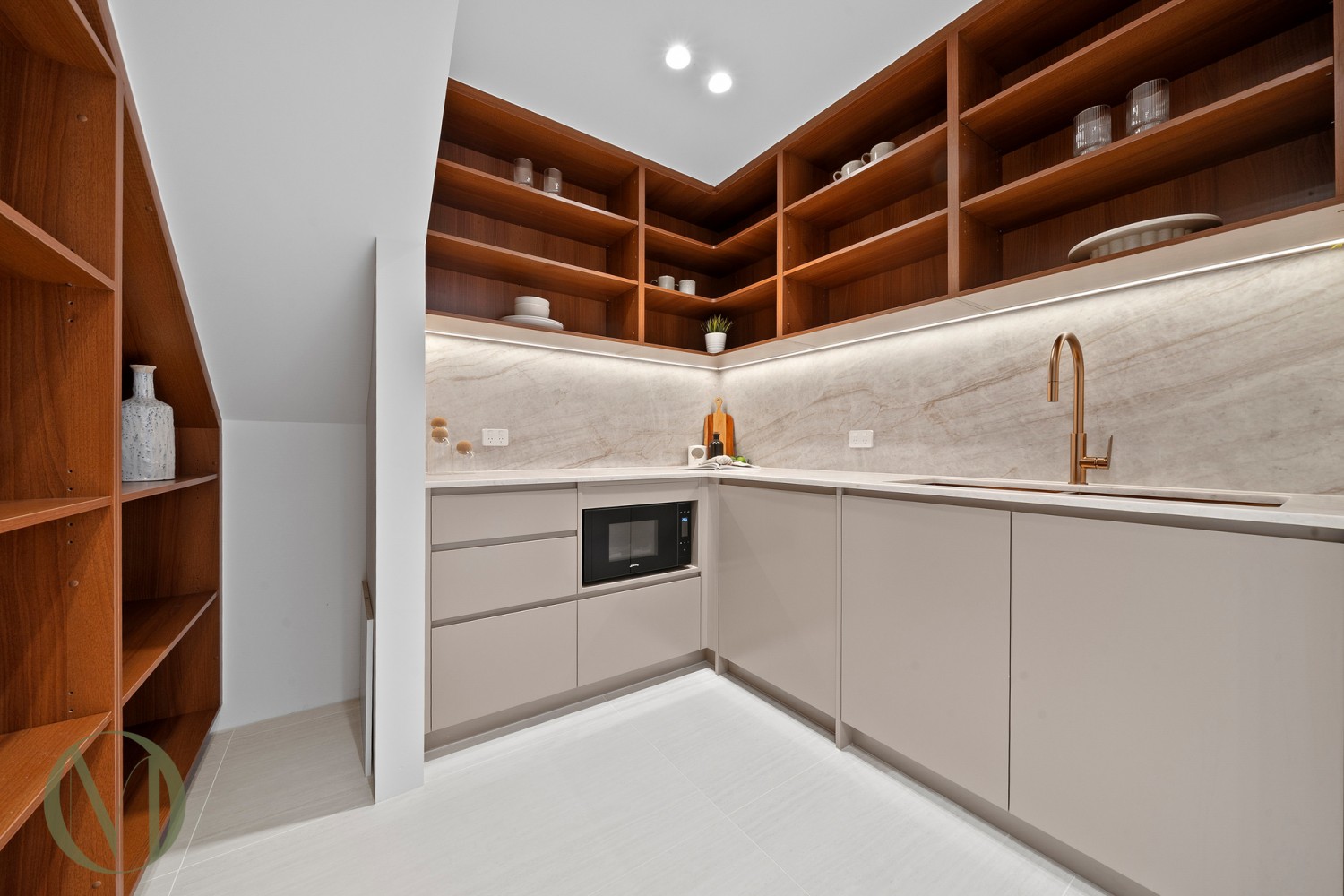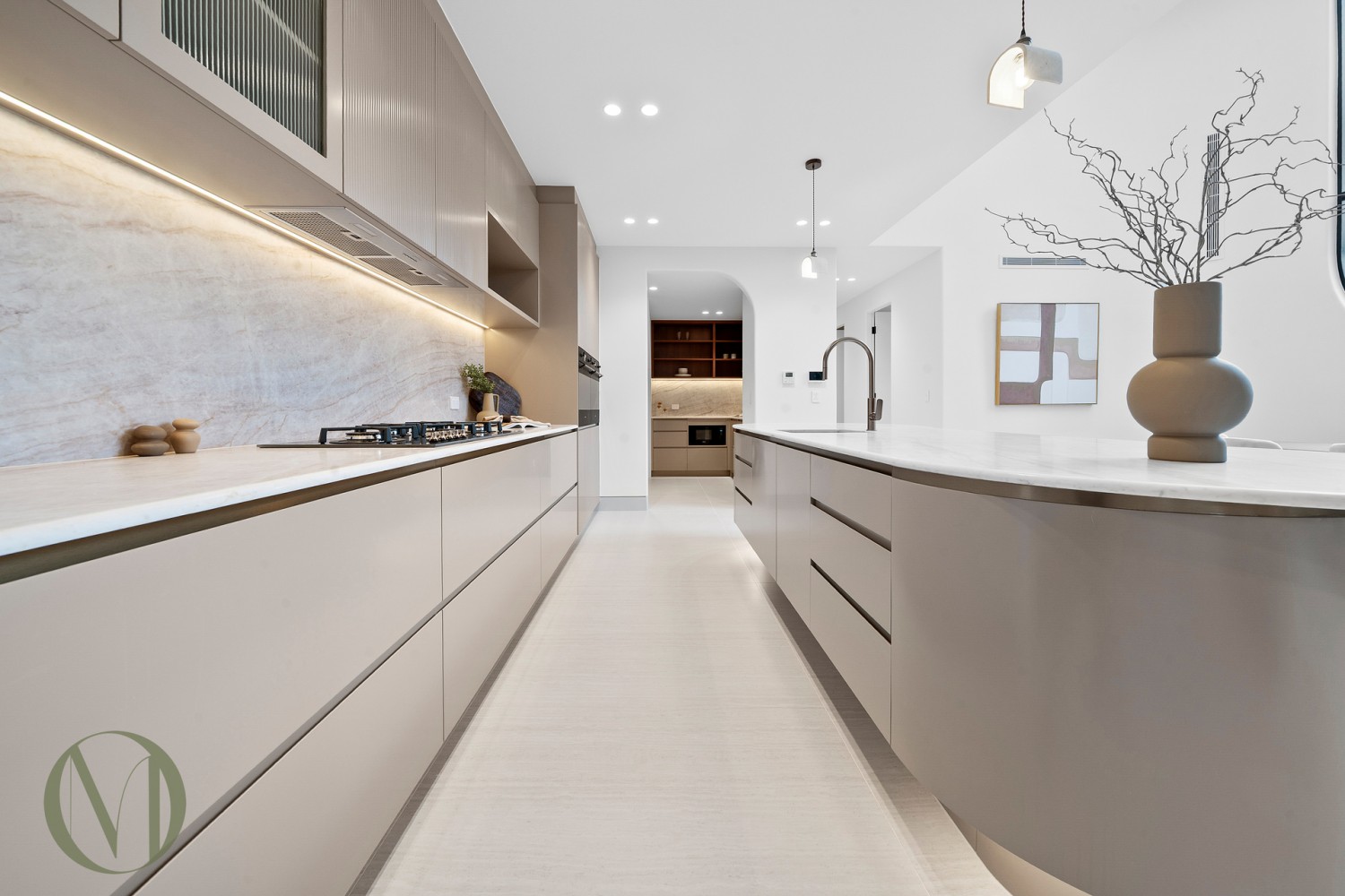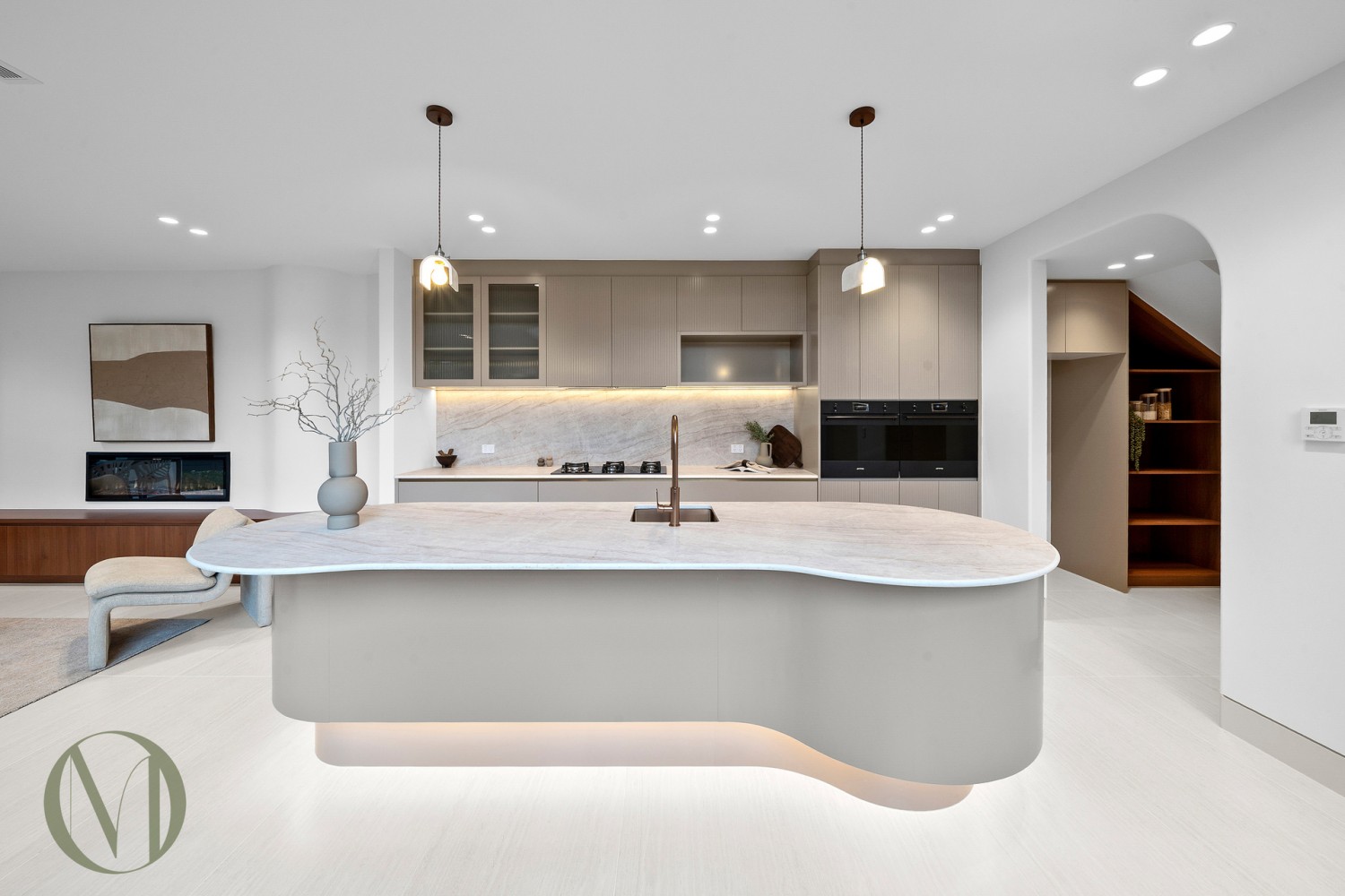 - Designer kitchen with statement curved island, butler's pantry, SMEG appliances, and Santorini Gold AC stone benchtops and splashback