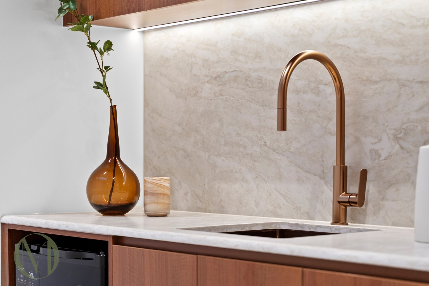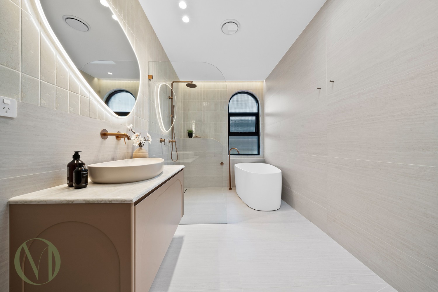- Bathrooms and laundry featuring Champagne Quantum Zero stone benchtops and Parisi tapware throughout
