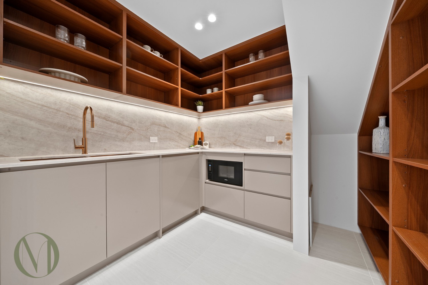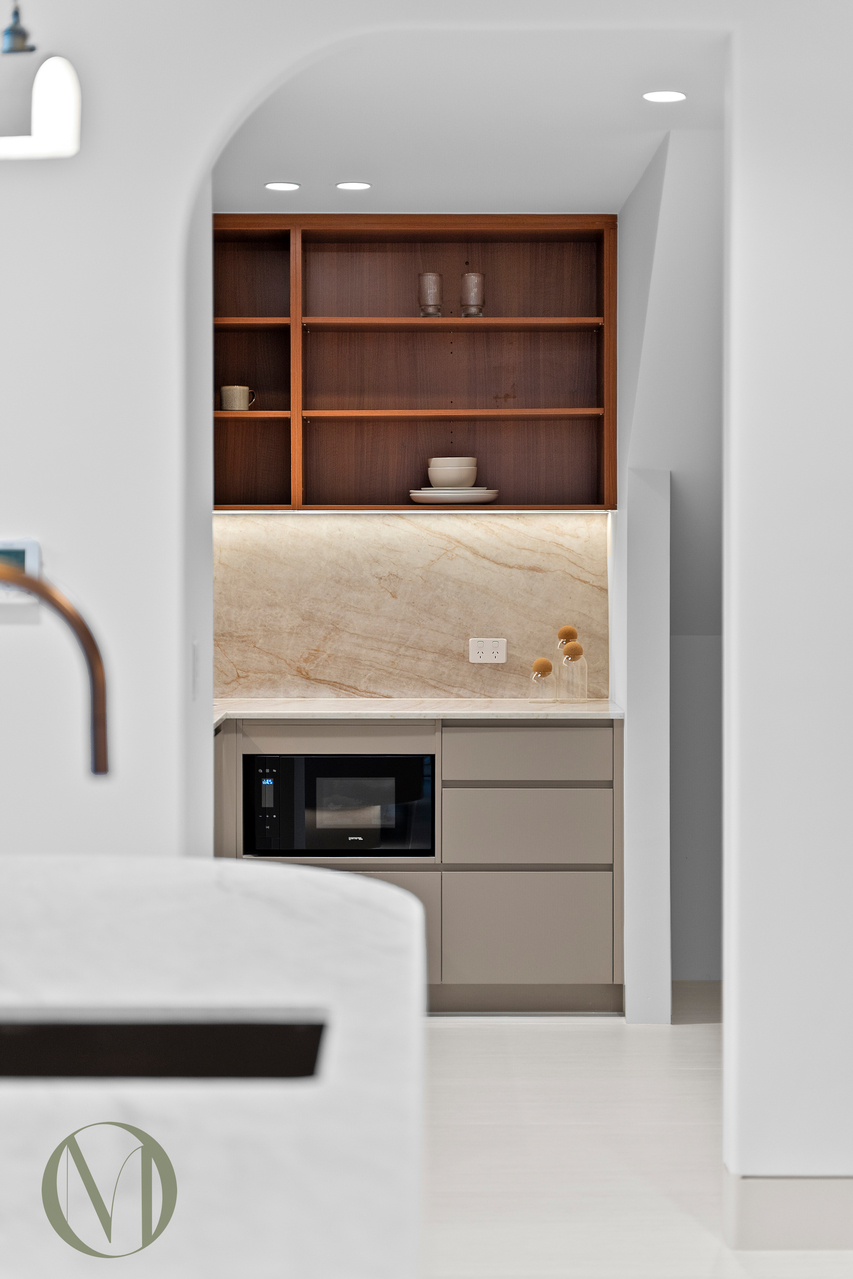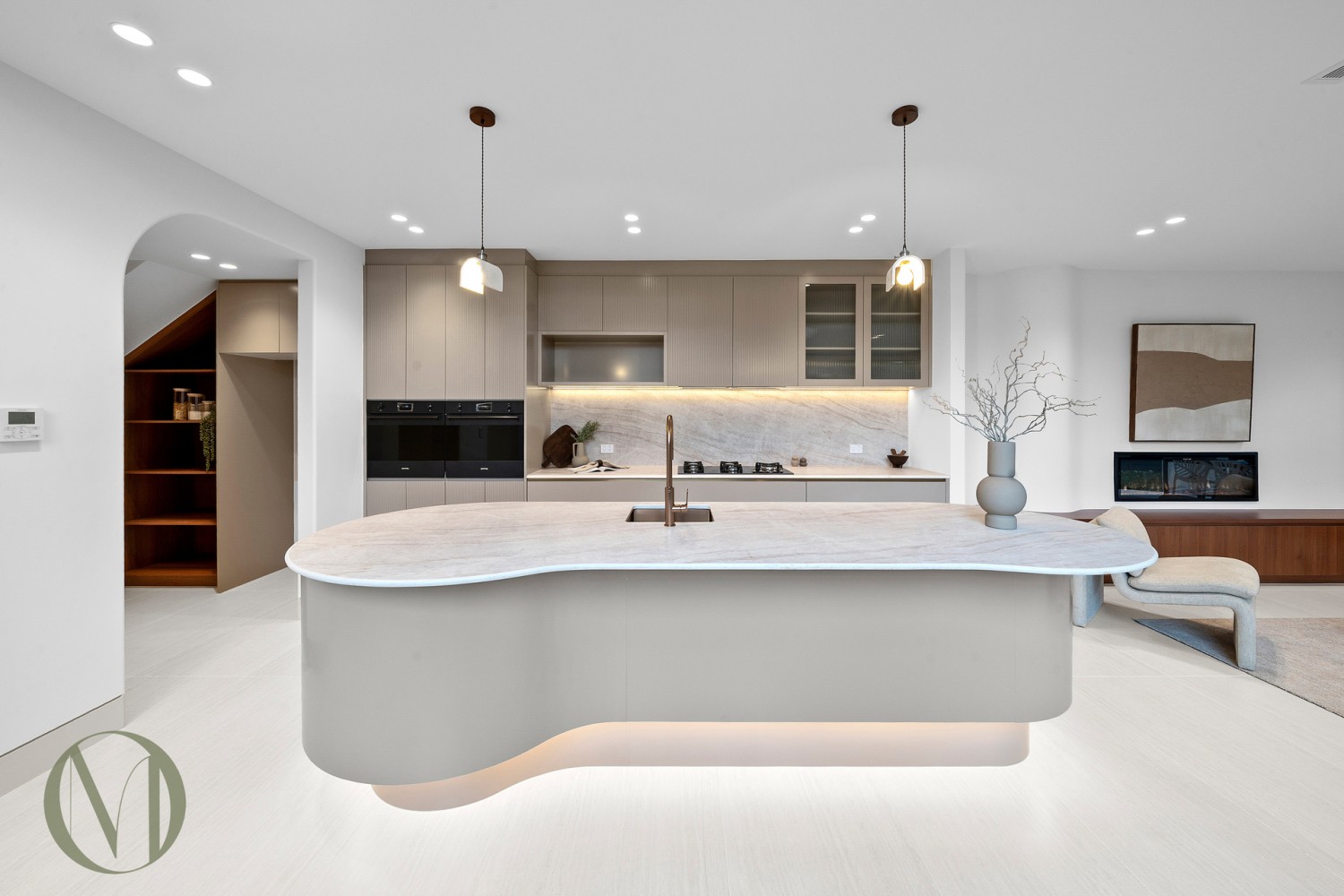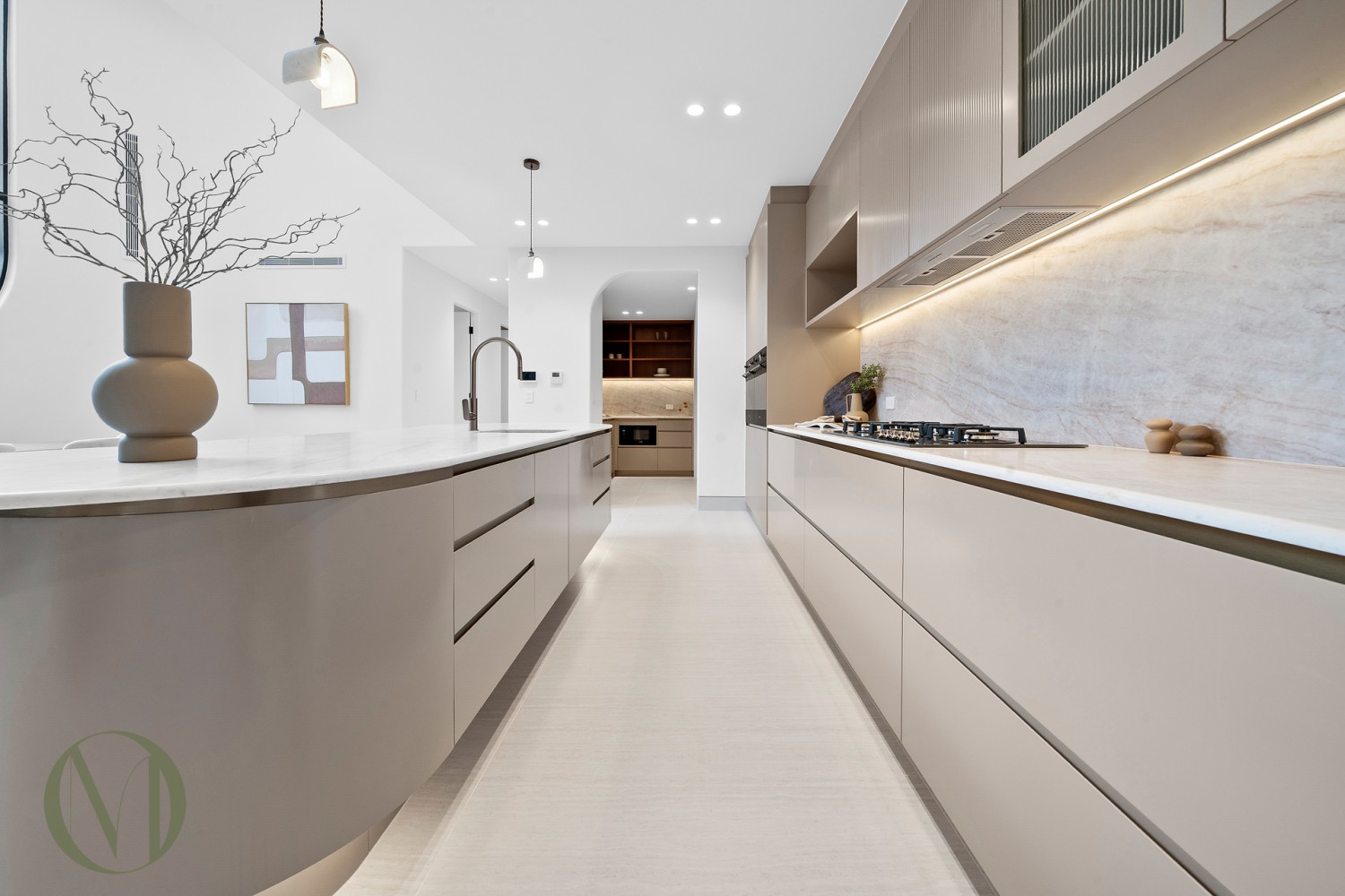 - Designer kitchen with curved island, butler's pantry, SMEG appliances, and Santorini Gold AC stone finishes