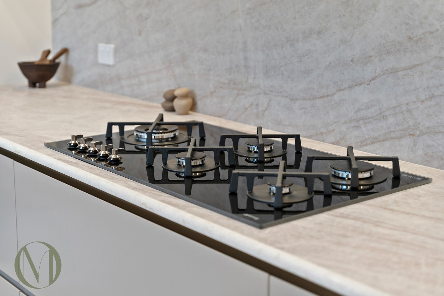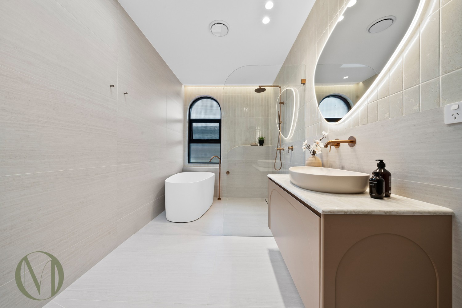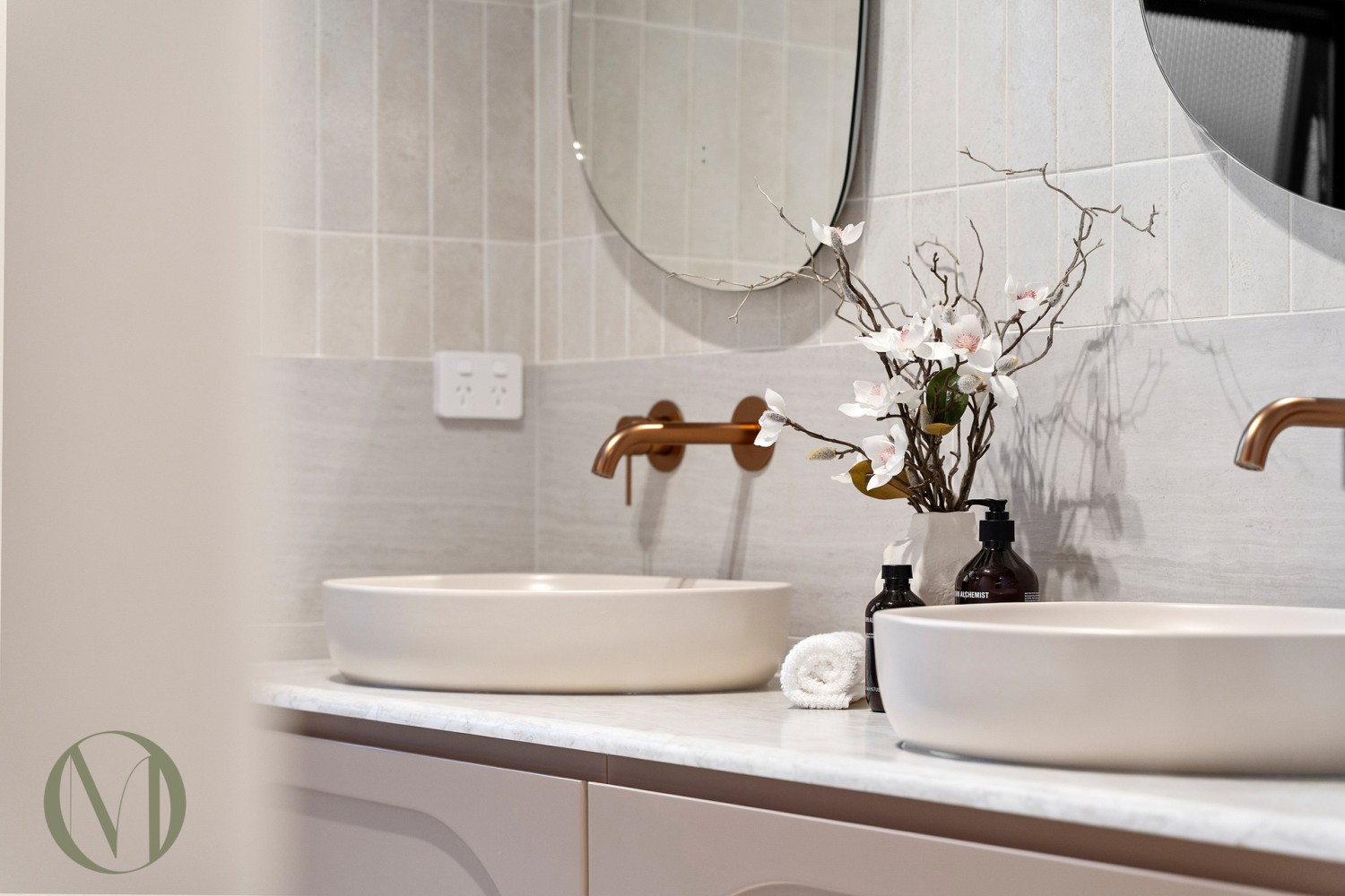 - Bathrooms and laundry adorned with Champagne Quantum Zero stone and Parisi tapware