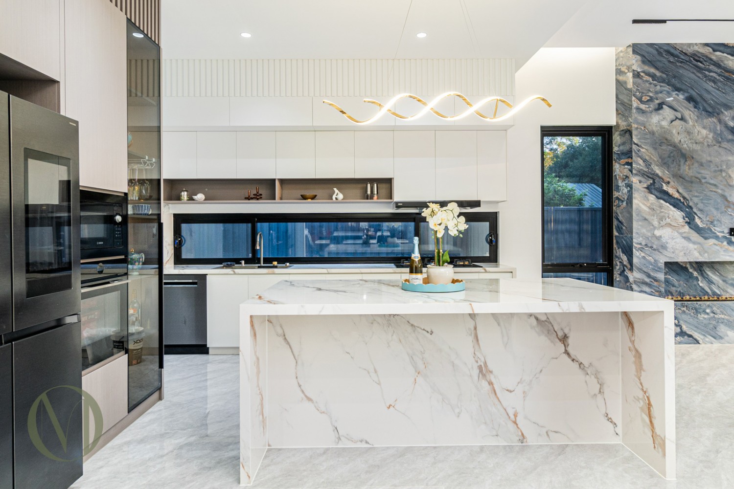 - Designer kitchen with custom bench tops, breakfast bar, high quality - Bosch microwave. oven and dishwasher, 900mm ducted Robam range hood and gas Robam stovetop.