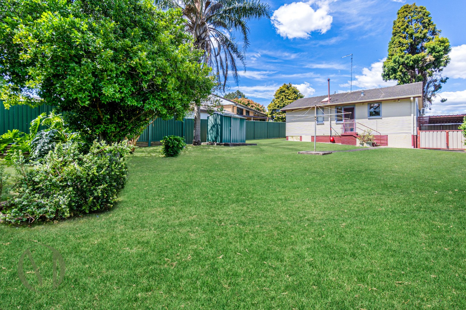 - Expansive backyard with garden shed and lawn area