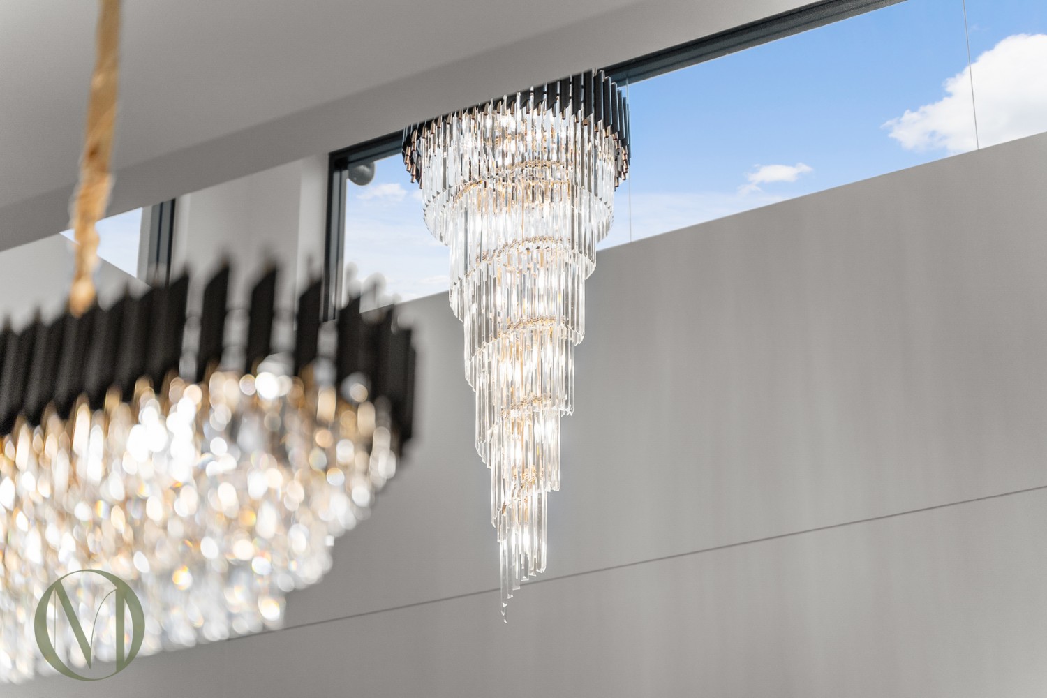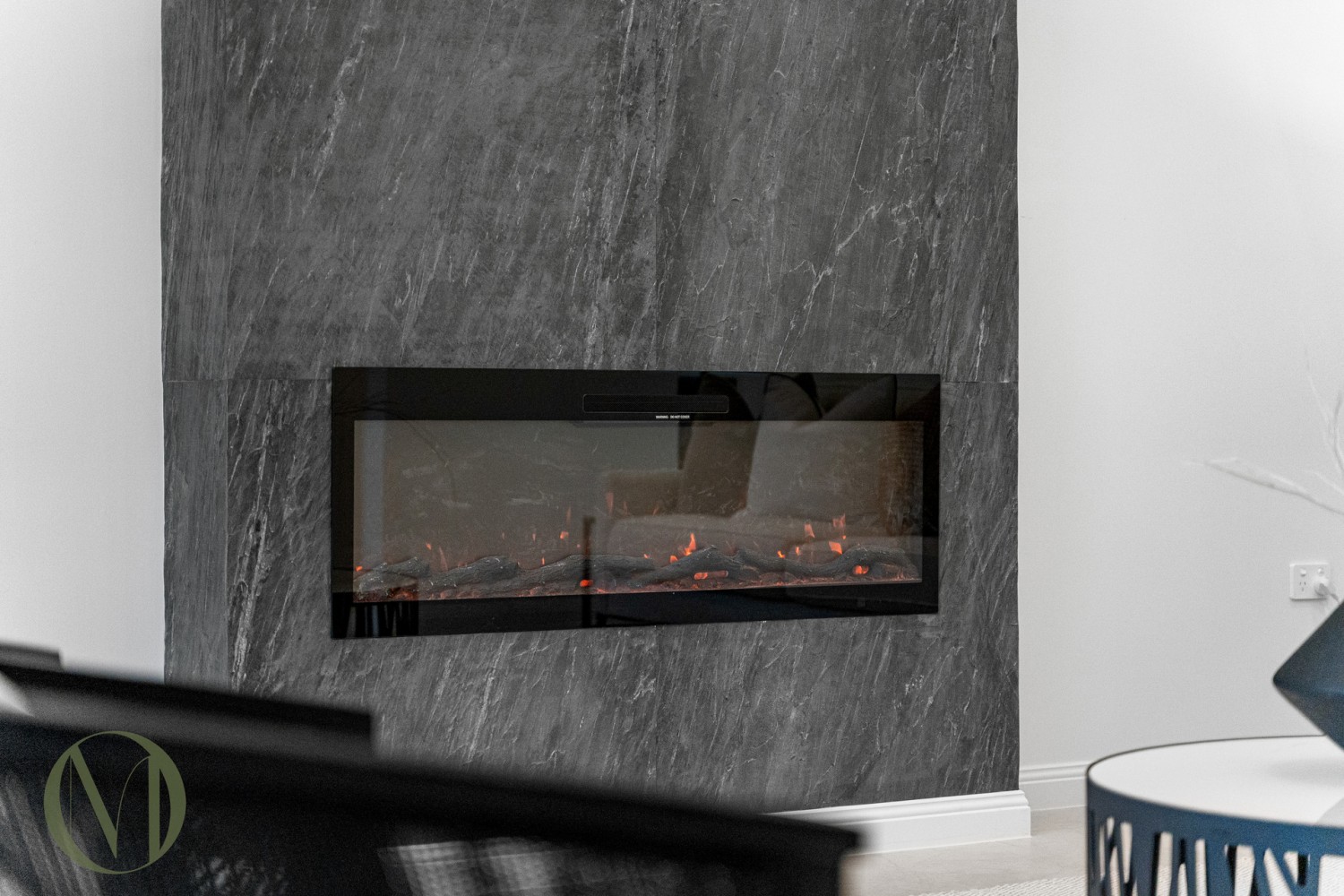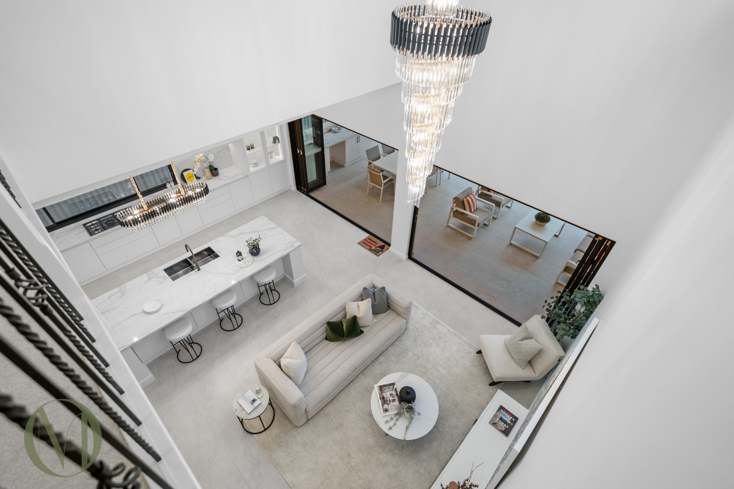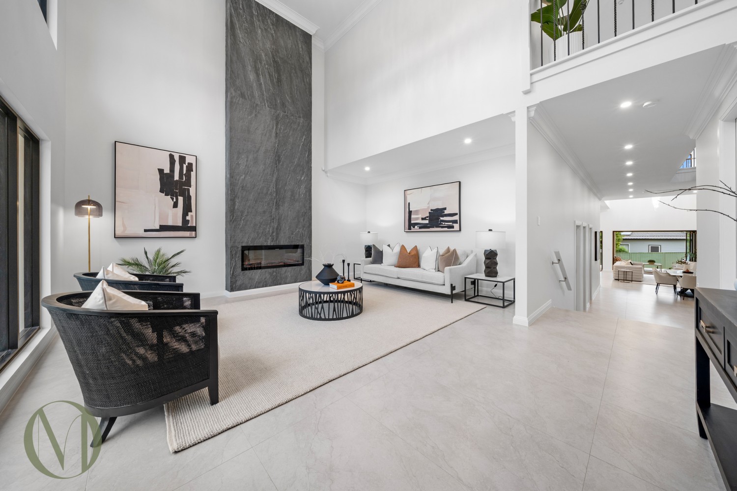 - Grand double-height living zone with a 6.6m ceiling and Emerald Green Natural Stone fireplace with 3D flame effects