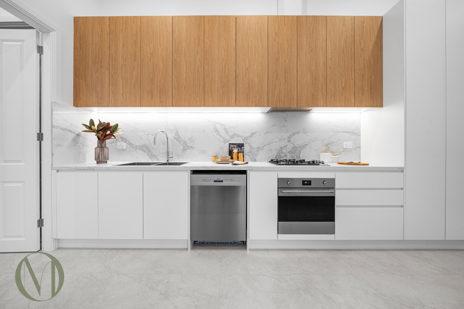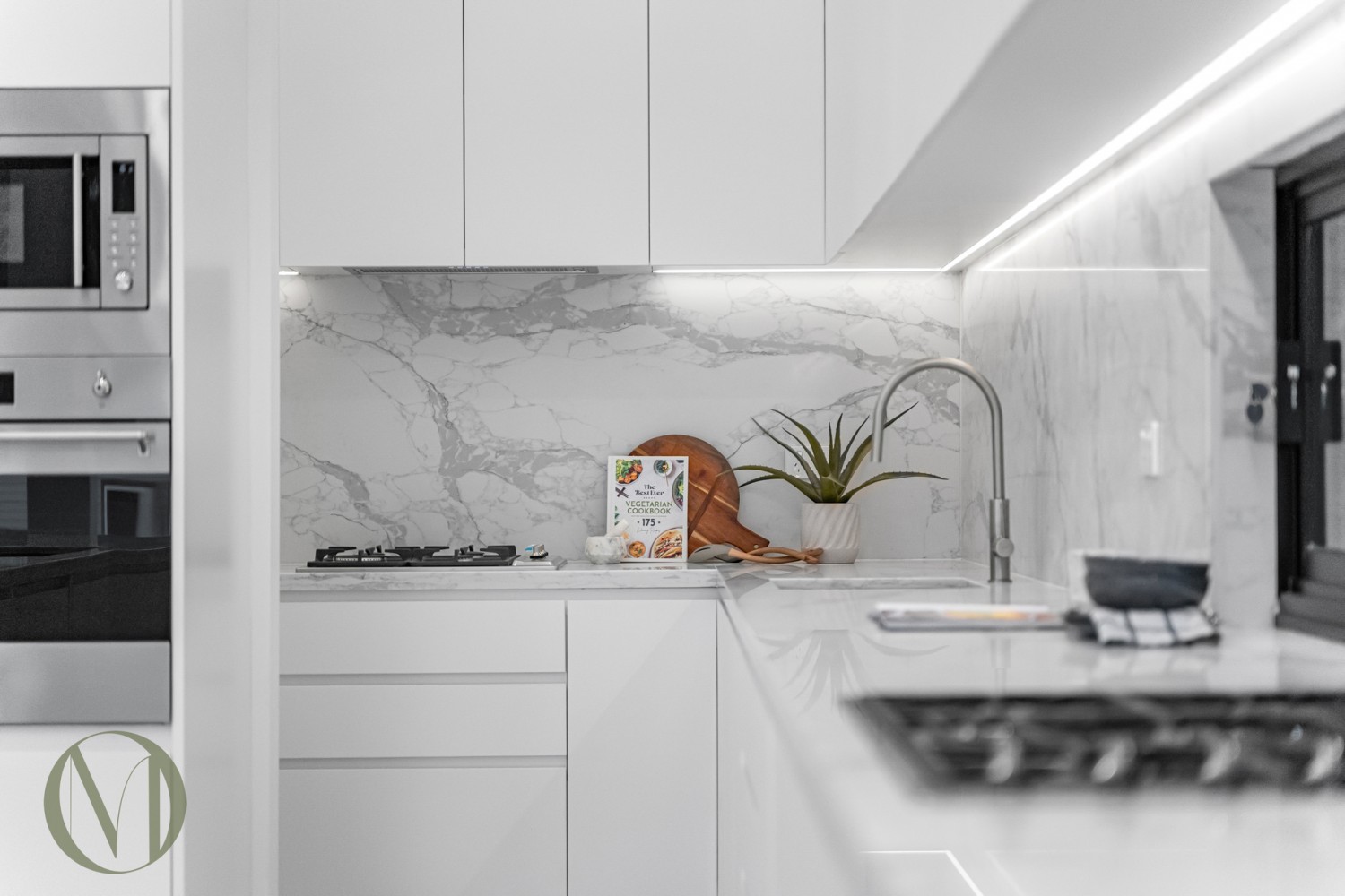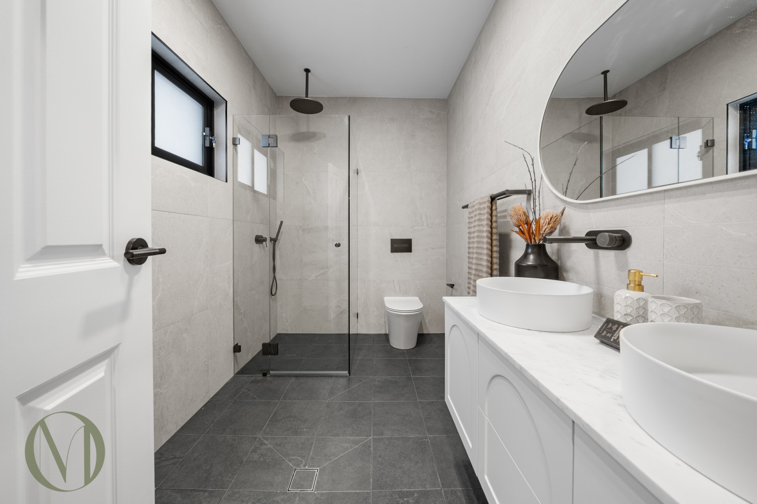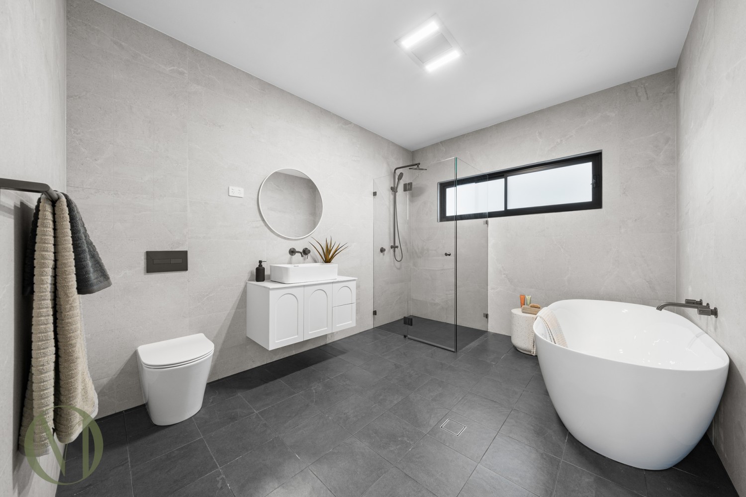 - Five luxurious bathrooms with frameless fluted shower screens, Calacatta stone vanities, Parisi fittings, and freestanding bathtub