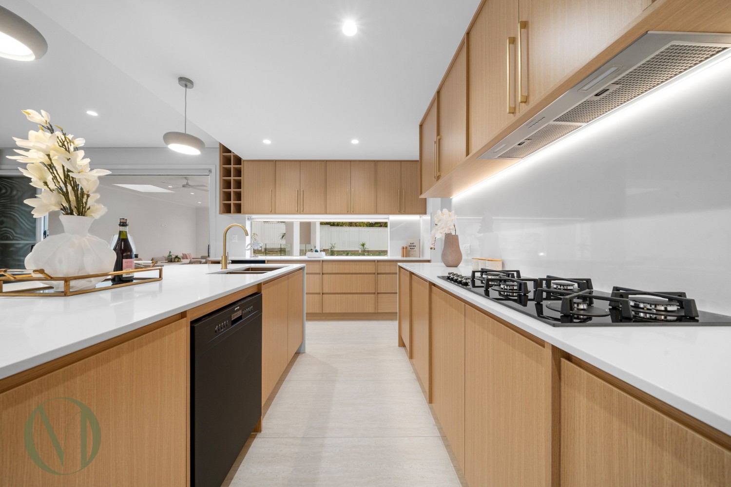 - Designer kitchen with premium appliances, stone island bench, and large walk-in pantry