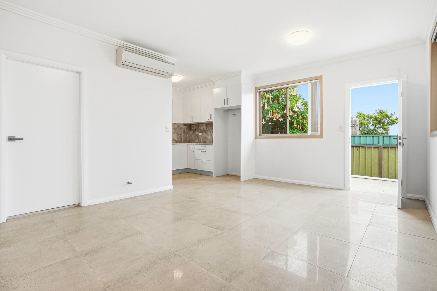 The home features a light-filled open plan layout with tiled flooring throughout, a modern kitchen with gas cooking, two bedrooms with built-in wardrobes, a sleek bathroom and air conditioning for year-round comfort. Street parking is also available.