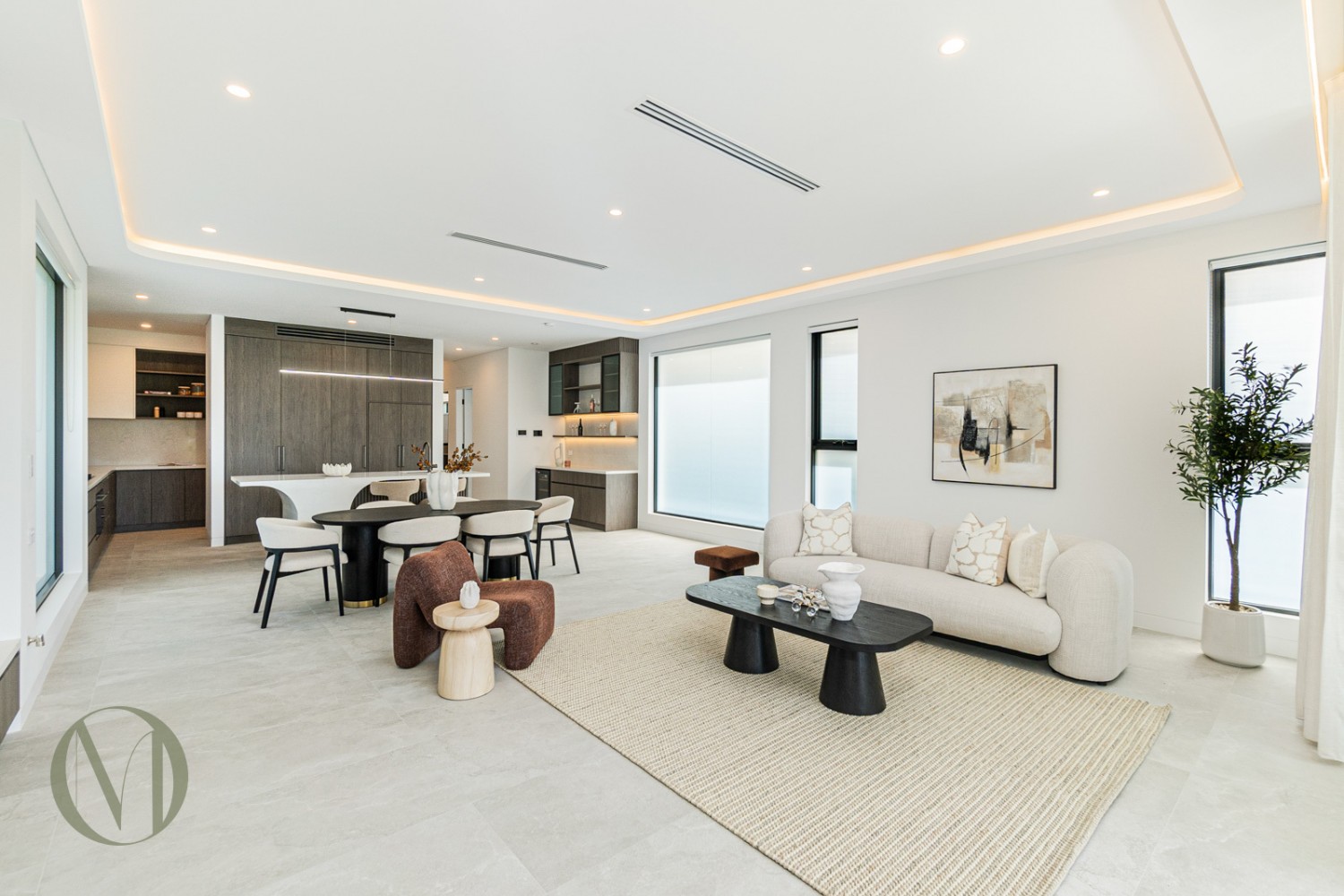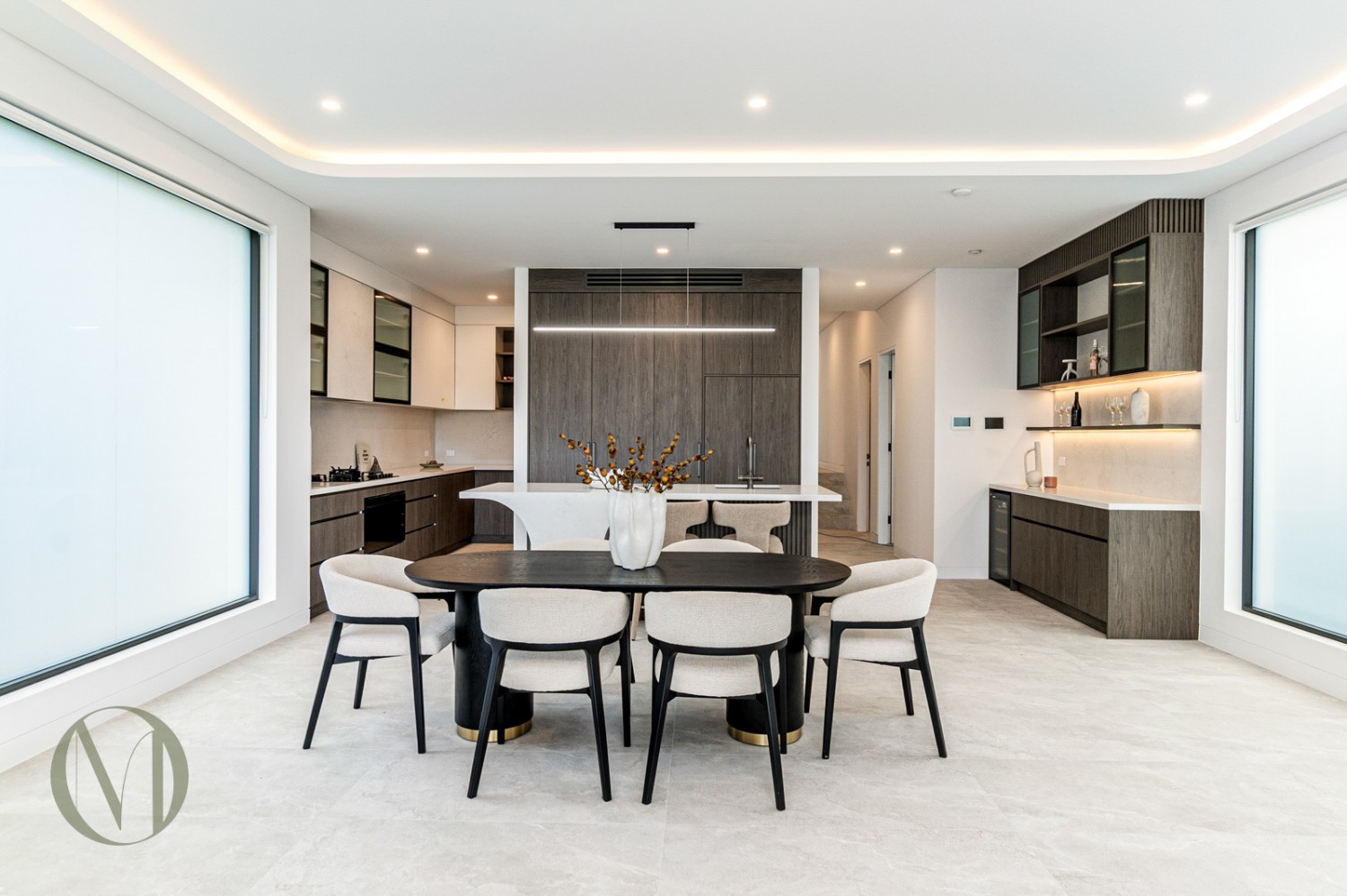 Expansive light-filled open-plan living and dining with statement fireplace