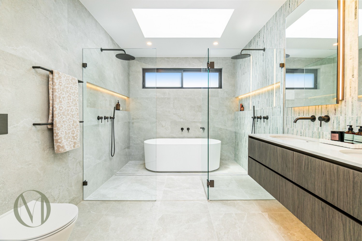 Designer main bathroom with freestanding bath, double shower, skylight, double vanity and sensor-lit mirrors