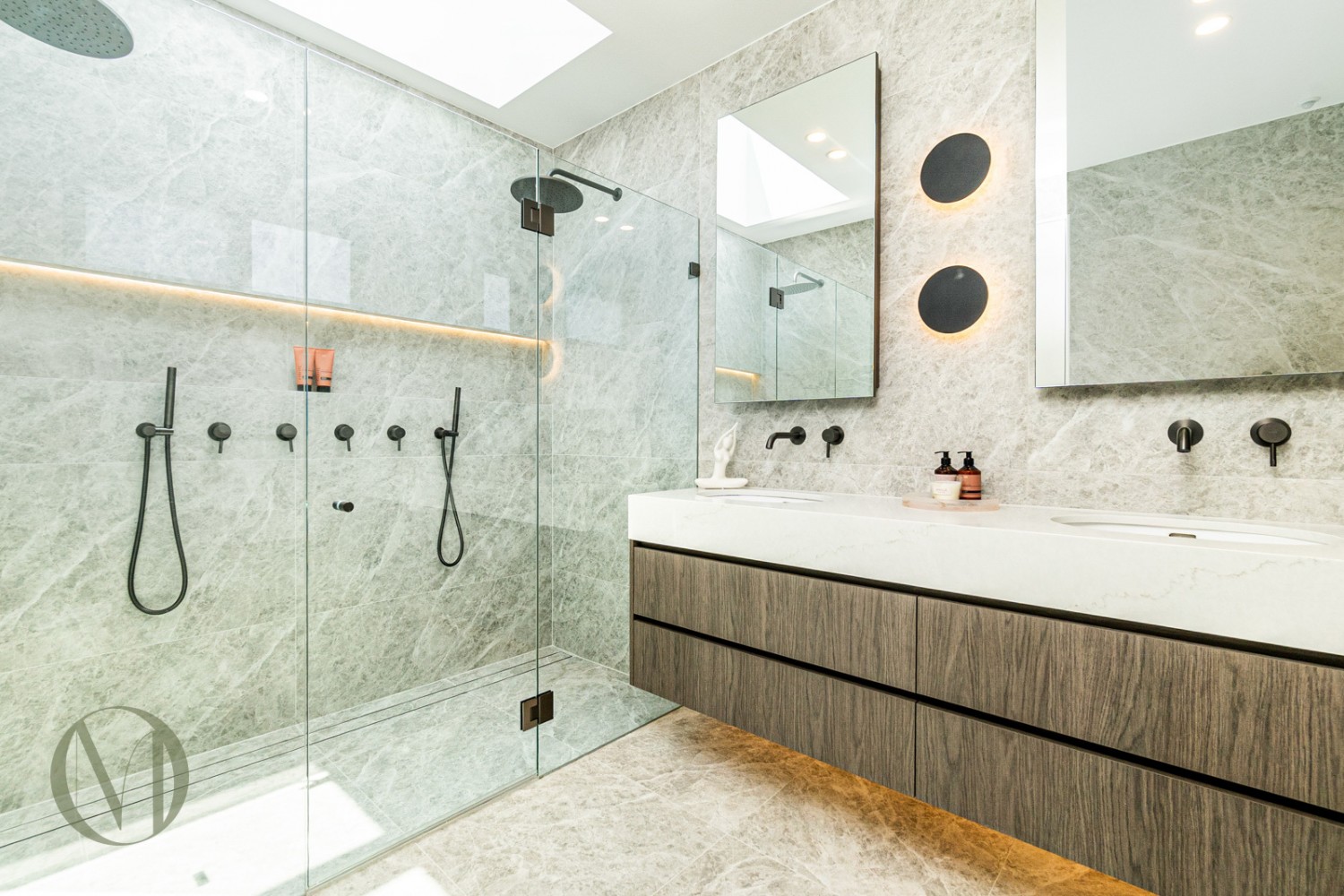 Luxe ensuite featuring double shower, skylight and double vanity