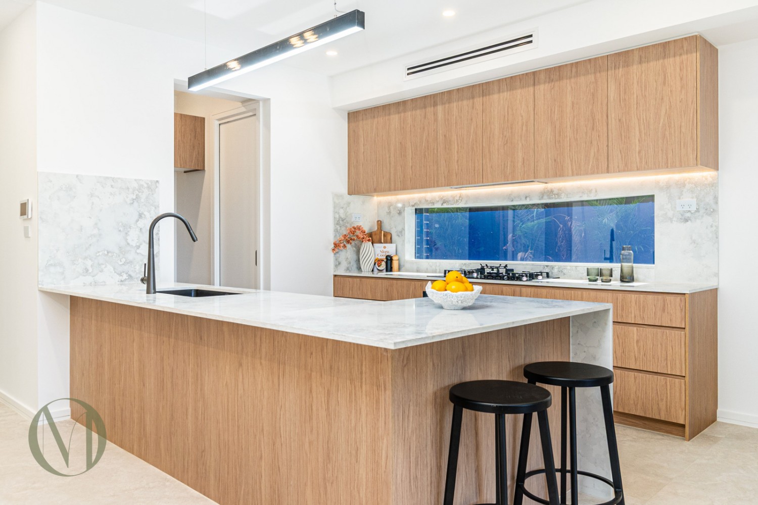 - A state-of-the-art kitchen featuring a large island benchtop, breakfast bar, stainless steel appliances, and gas cooktop