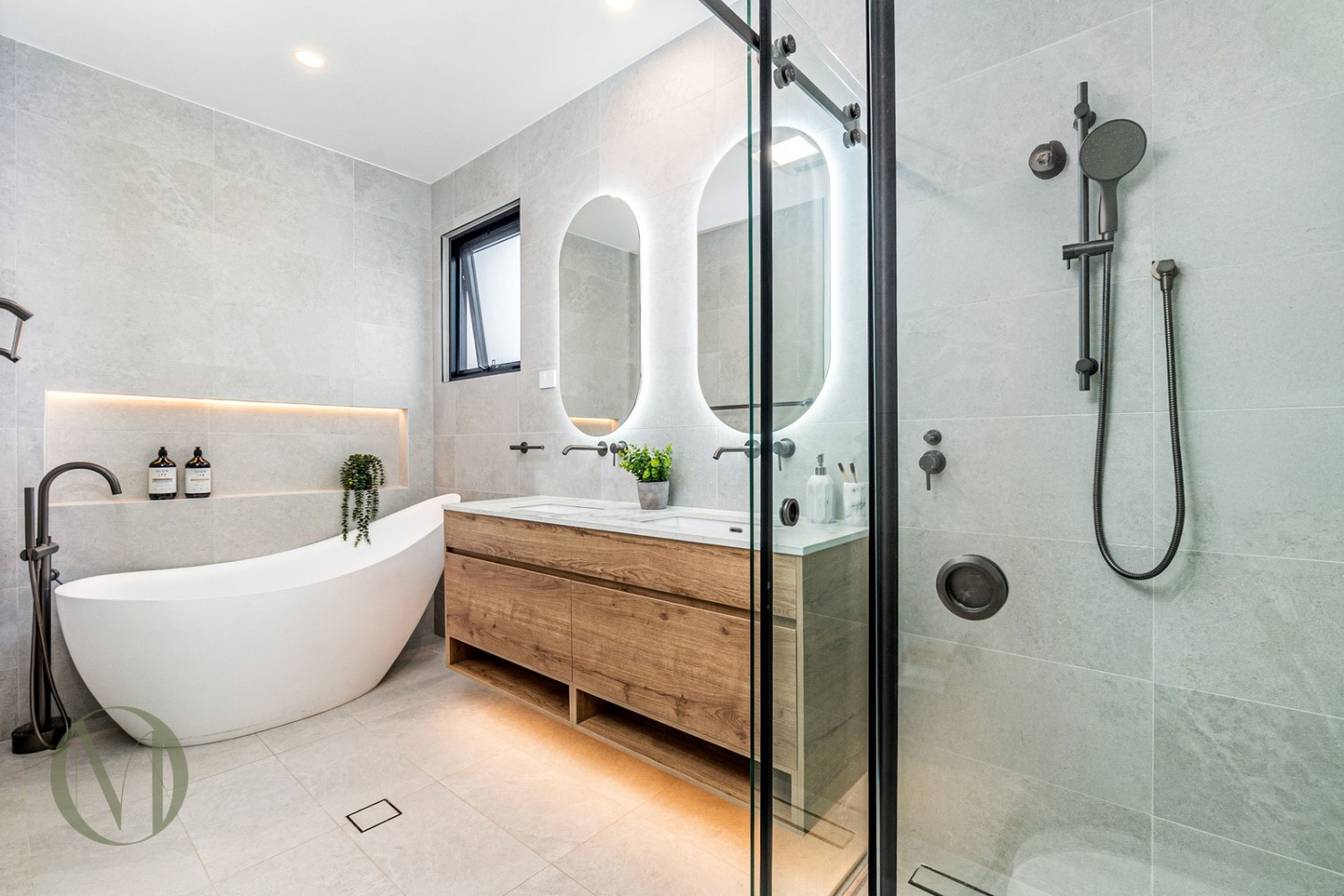 -Stylish Family Bathroom: Featuring tiles, a shower, and a freestanding bathtub for ultimate relaxation.