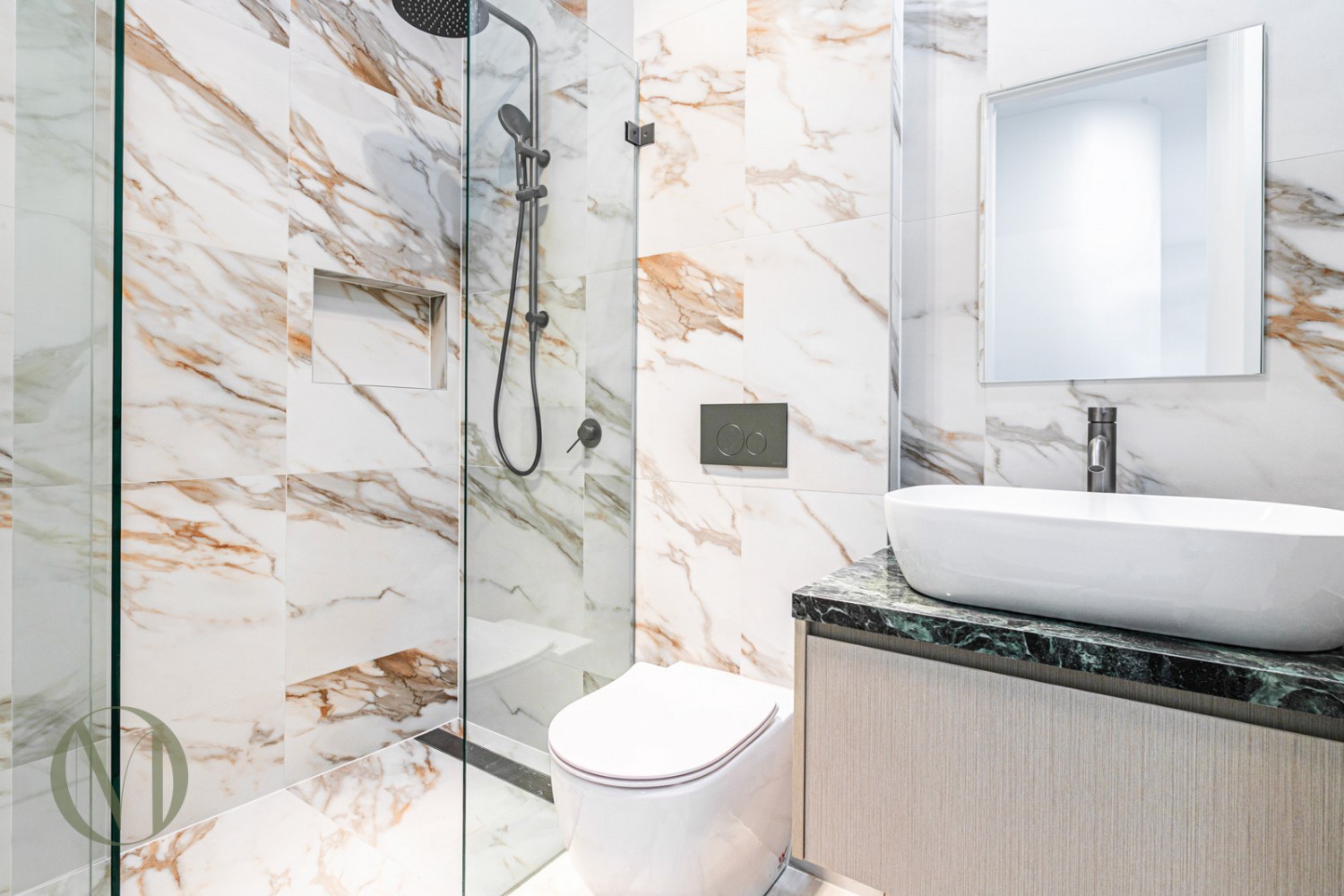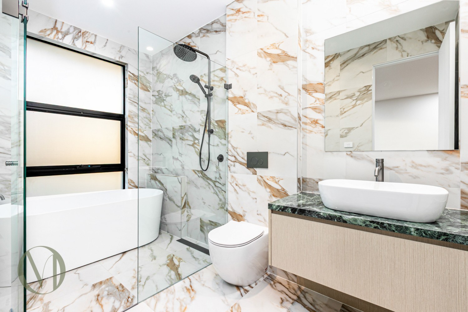 Stylish Family Bathroom: Featuring tiles, a shower, and a freestanding bathtub for ultimate relaxation.