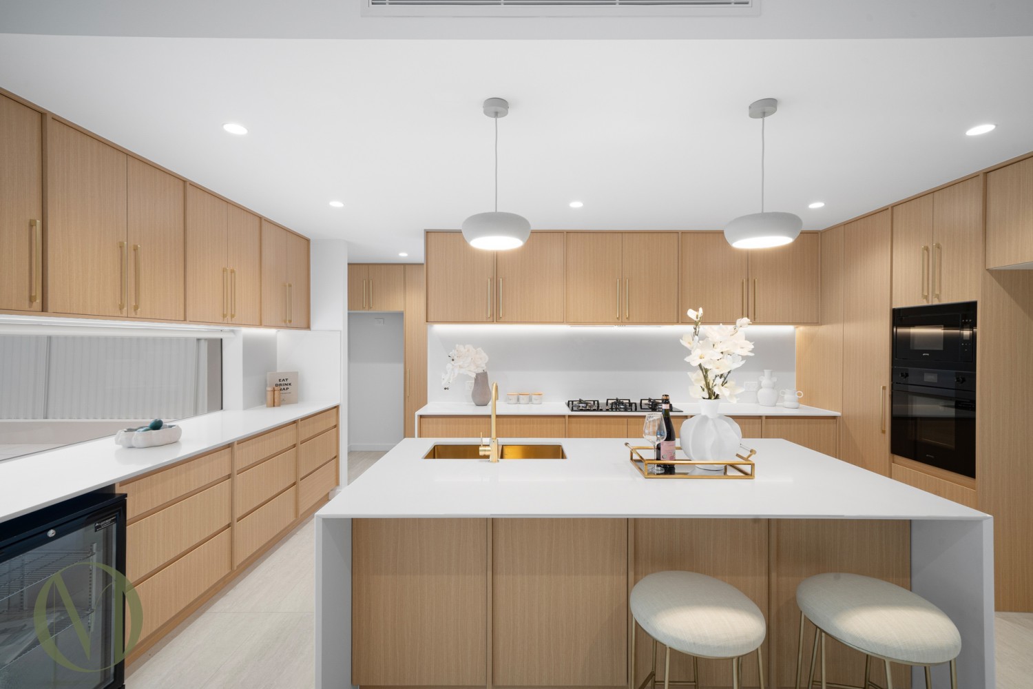 - Designer kitchen with premium appliances, stone island bench, and large walk-in pantry