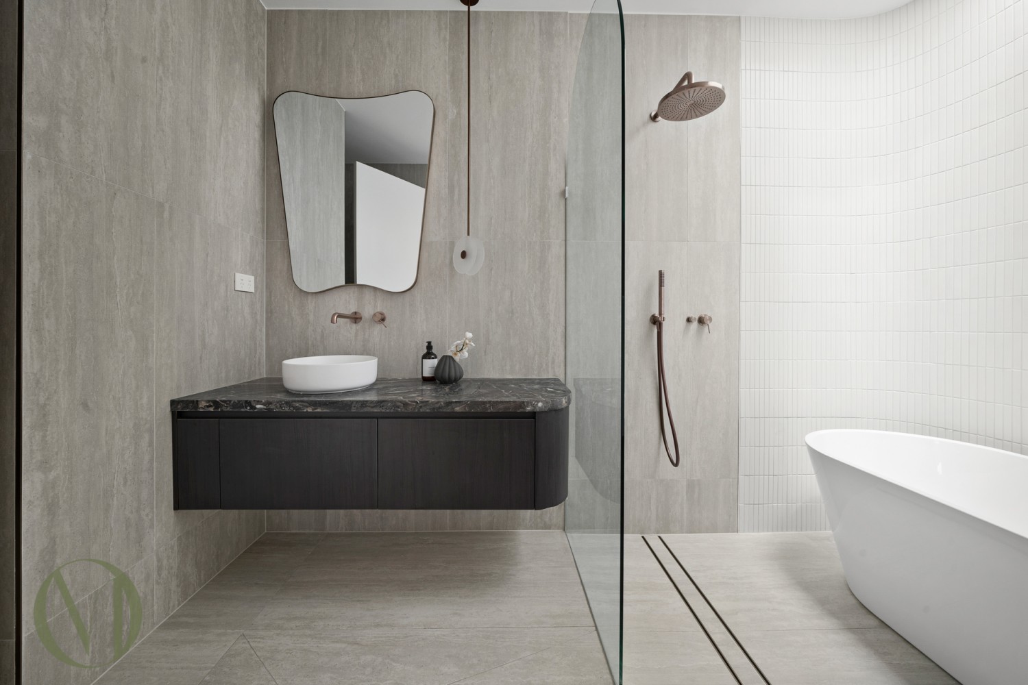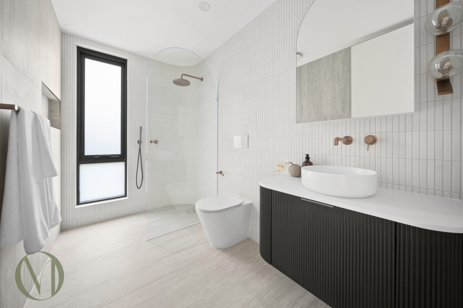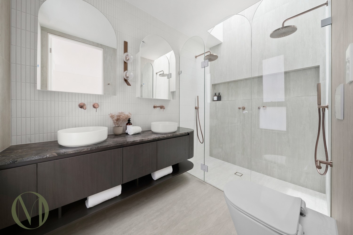 - Opulent master ensuite with double vanity, curved custom shower screens and skylight.
