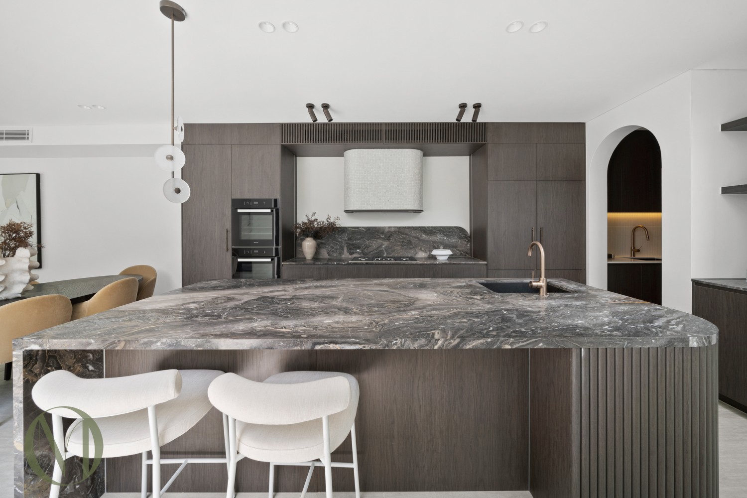 - Showpiece designer kitchen with stone island, splashback and sculptural rangehood, complete with integrated fridge and freezer.