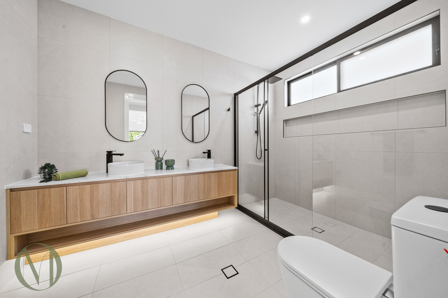 • Three bathrooms featuring floor to ceiling tiles